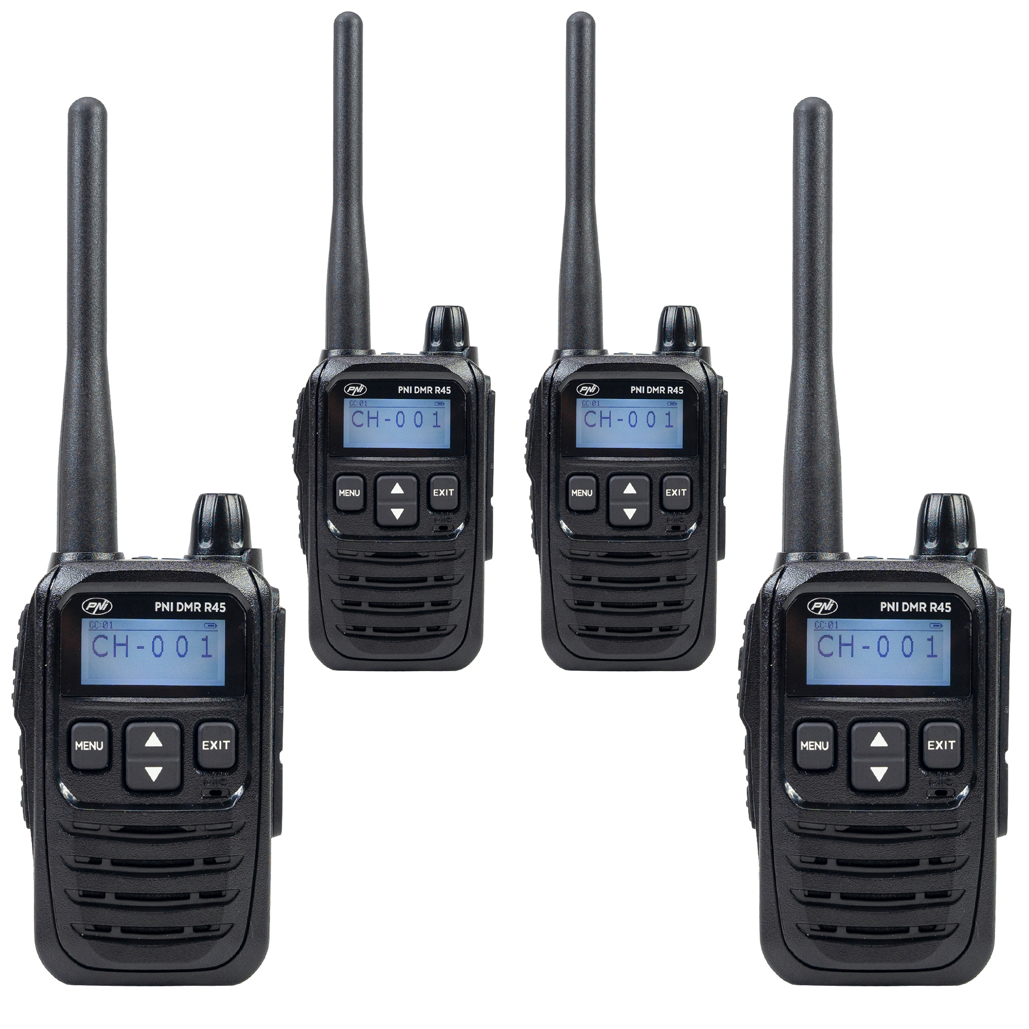 Staţii radio PMR de vanzare la subpret, Kit 4 statii radio portabile PNI DMR R45, digital si analogic, 446MHz, 16 canale digitale si 99 canale analogice, functie inregistrare voce, baterie Li-Ion 2000mAh.