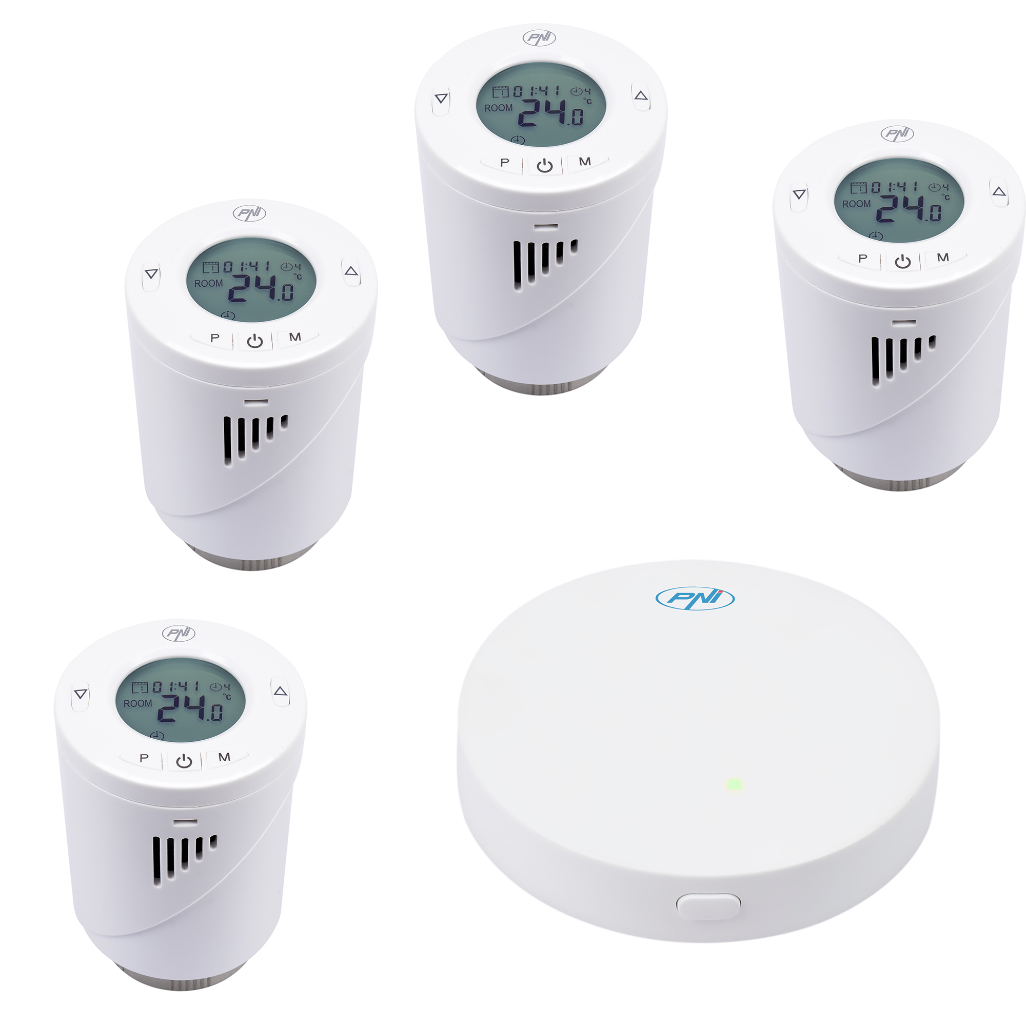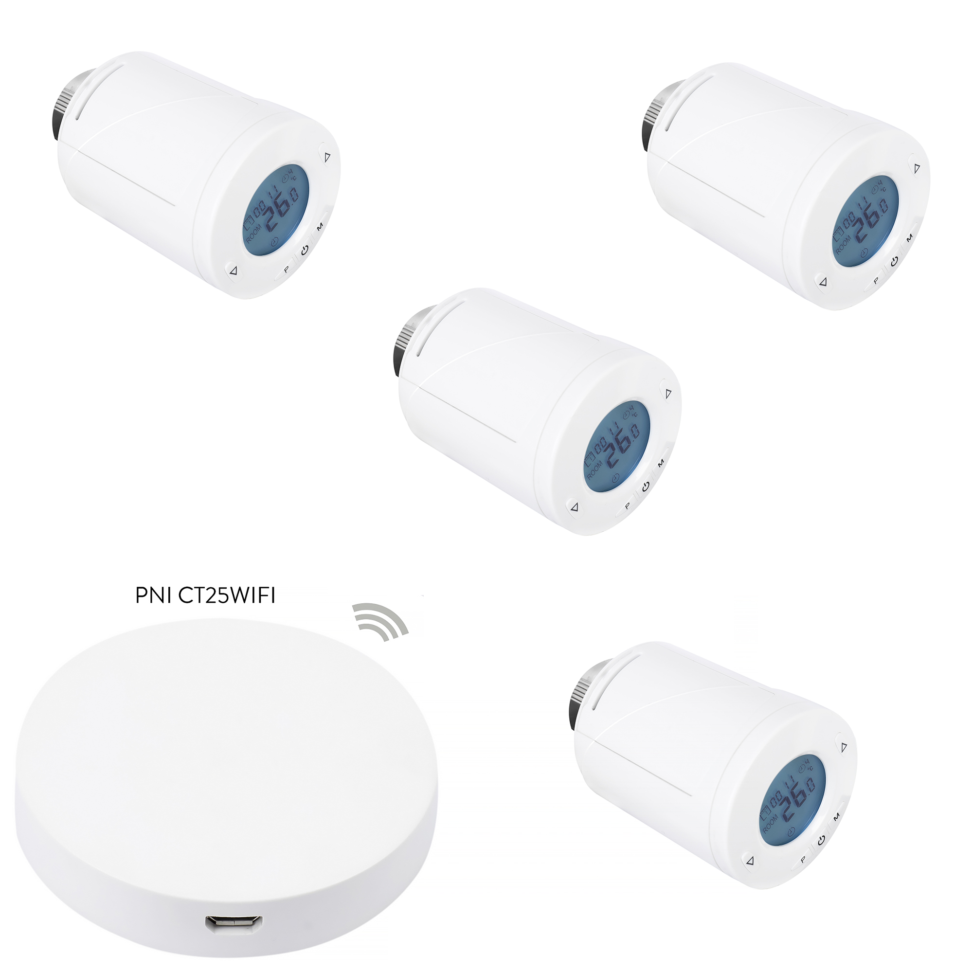 Termostate de vanzare la subpret, Kit Wifi 4 bucati cap termostatic inteligent PNI CT25T pentru calorifer si Hub PNI CT25WIFI cu control prin Internet, aplicatie de mobil Tuya Smart.