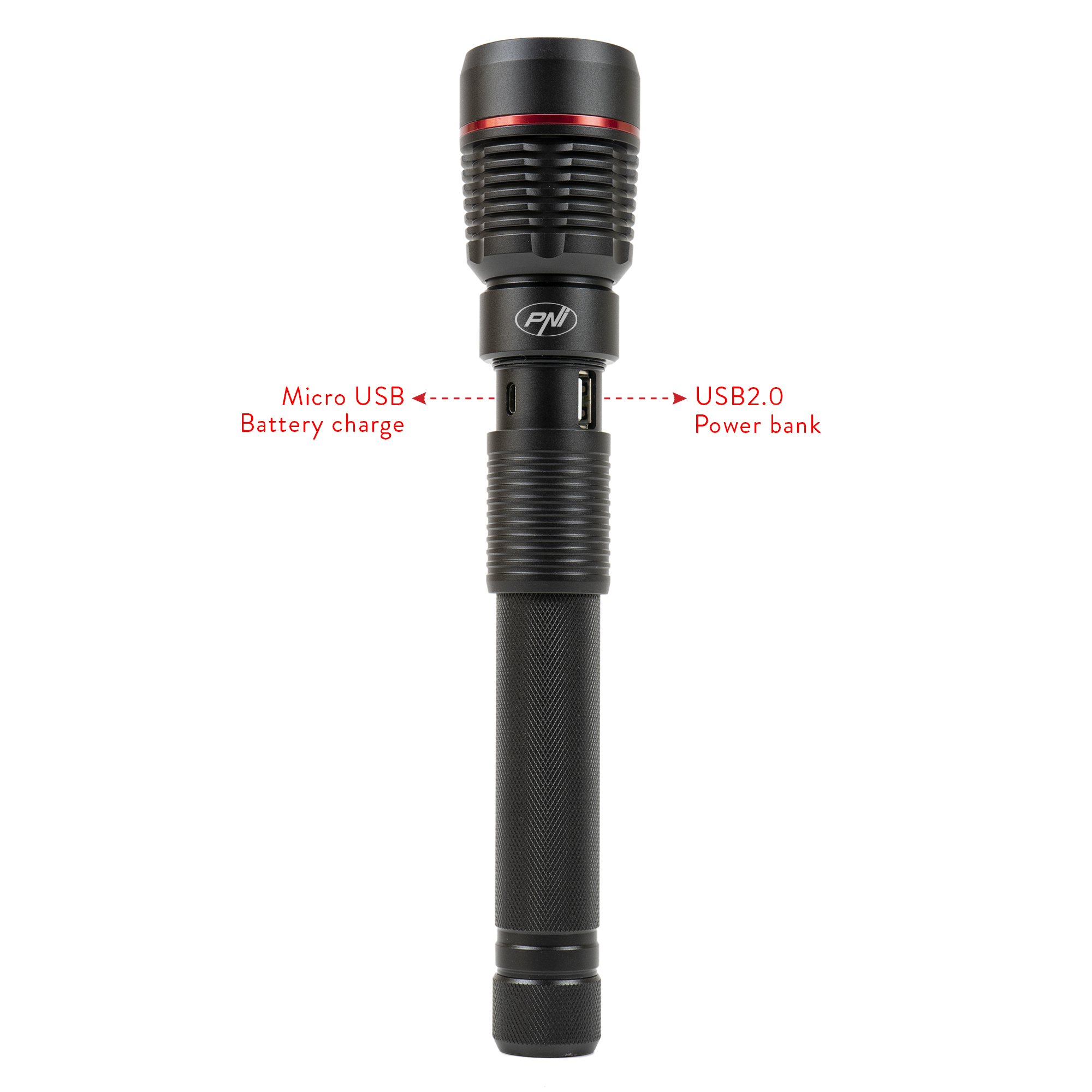 Lanterne de vanzare la subpret, Lanterna PNI Adventure F450 din aluminiu cu focus si functie BOOST, led 20 W, 1500 lm pana la 450 m, IPX5, power bank cu iesire USB, incarcare prin micro USB, acumulator 4400 mAh inclus, functioneaza 10 ore continuu.