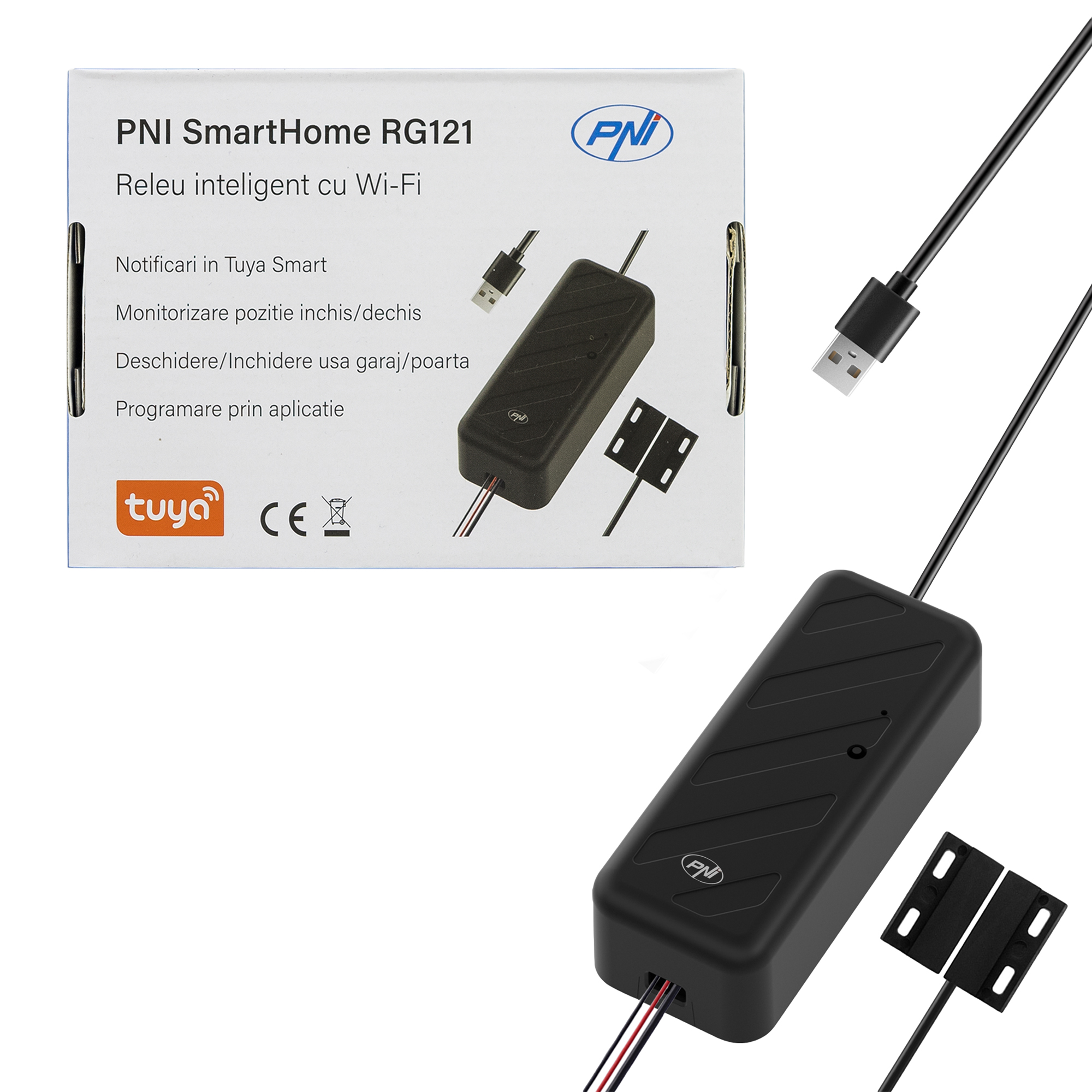 Accesorii control acces de vanzare la subpret, Releu inteligent PNI SmartHome RG121 cu Wi-Fi pentru comanda deschidere usa garaj/poarta, compatibil cu aplicatia Tuya, alimentare 5 V.