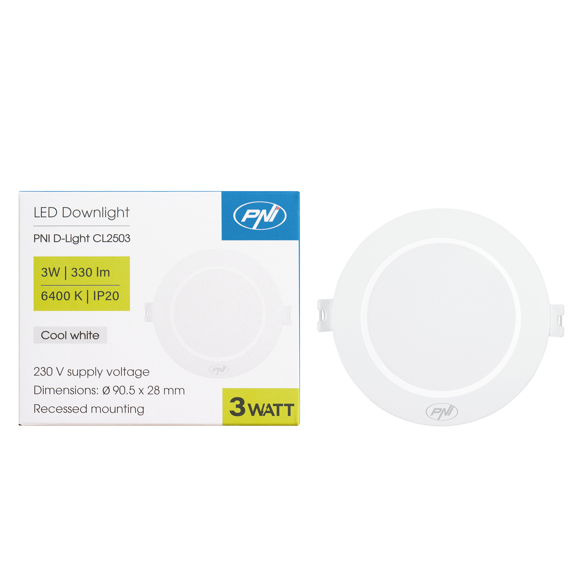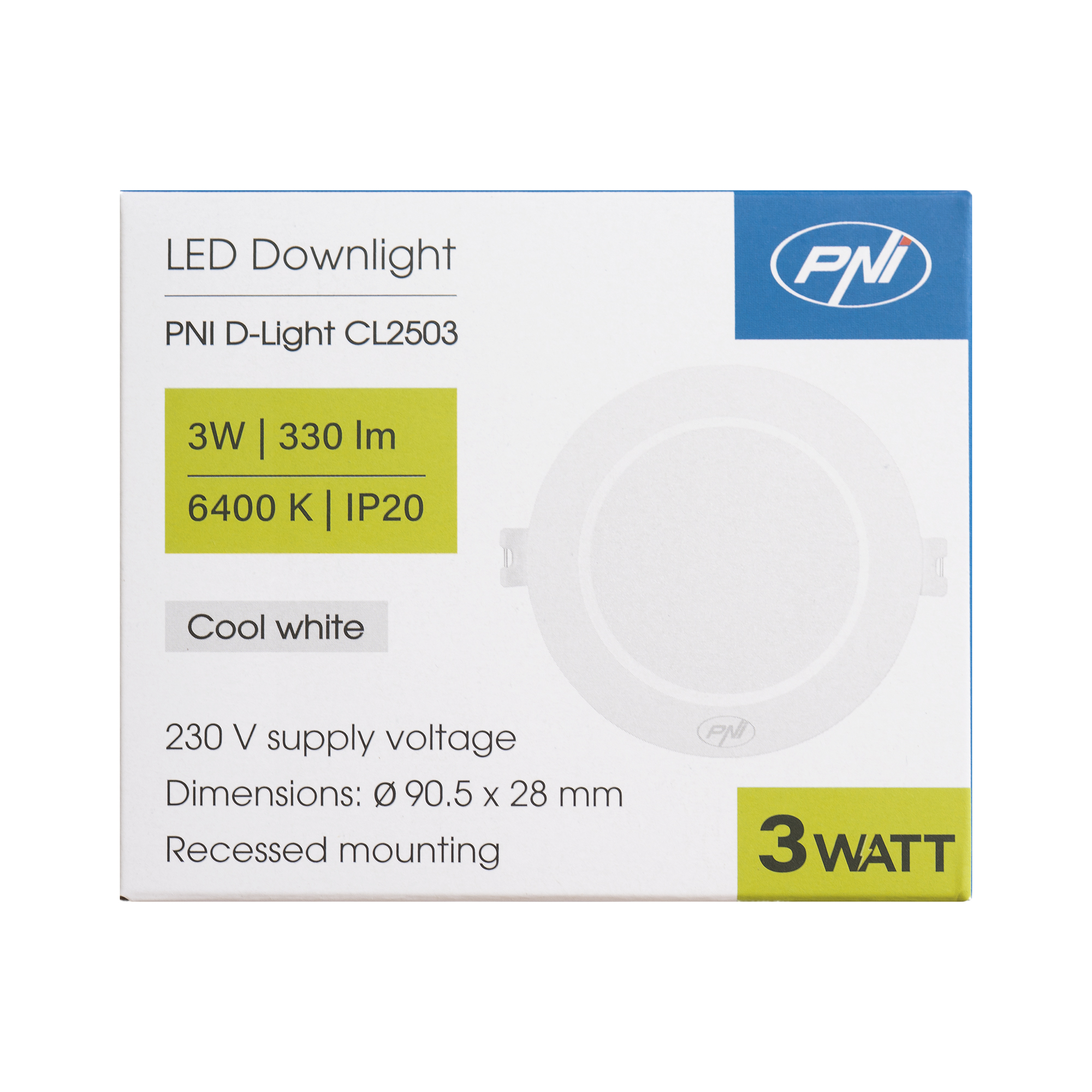 Corpuri de iluminat de vanzare la subpret, Spot LED PNI D-Light CL2503 3W, incastrabil, rotund 9 cm, 6400K, alimentare 230V, 330 lm, alb rece.