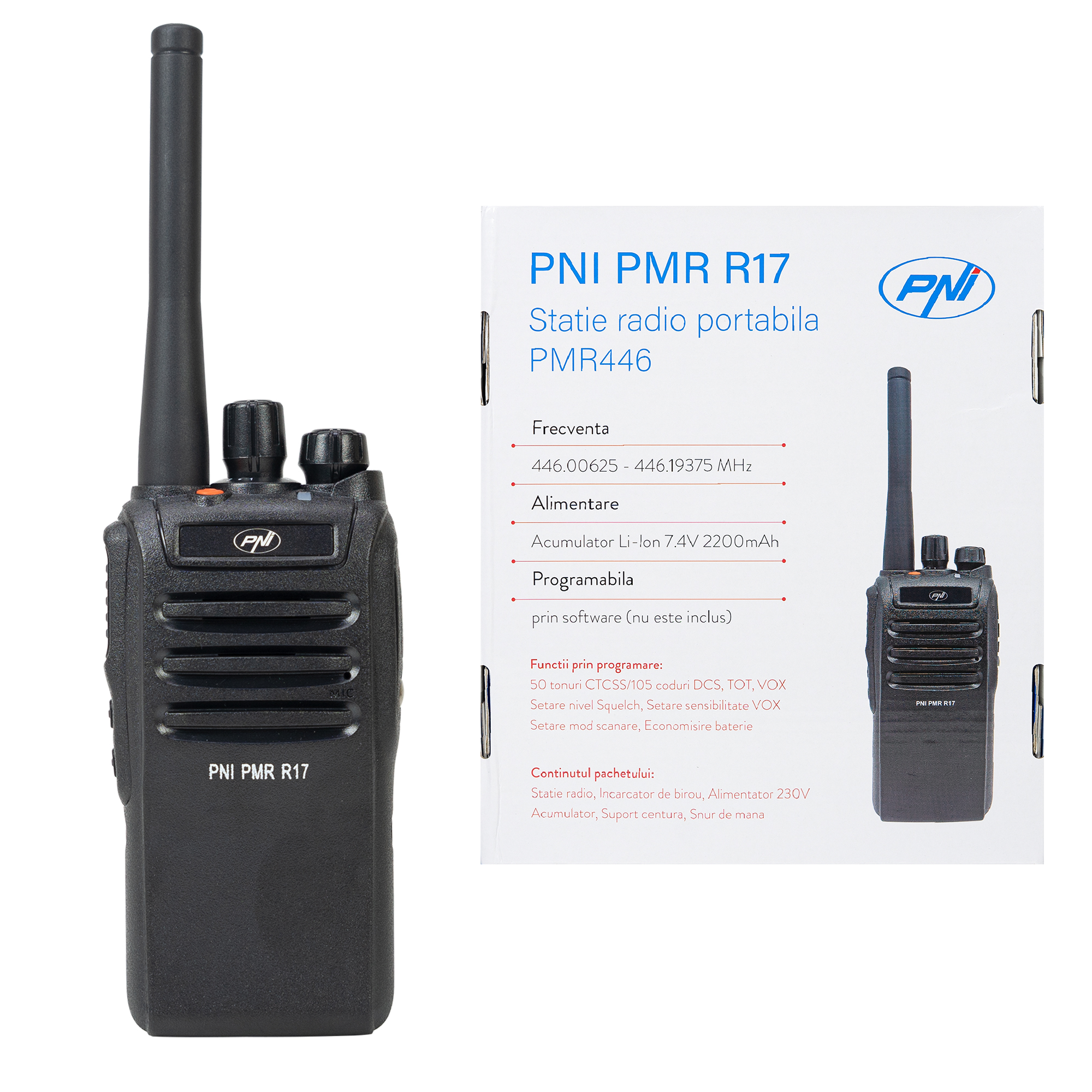 Staţii radio PMR de vanzare la subpret, Statie radio portabila PNI PMR R17 446MHz, 0.5W, 16 canale PMR si tonuri 50 CTCSS si 104 DCS, programabila, Li-Ion 2200 mAh, IP68.