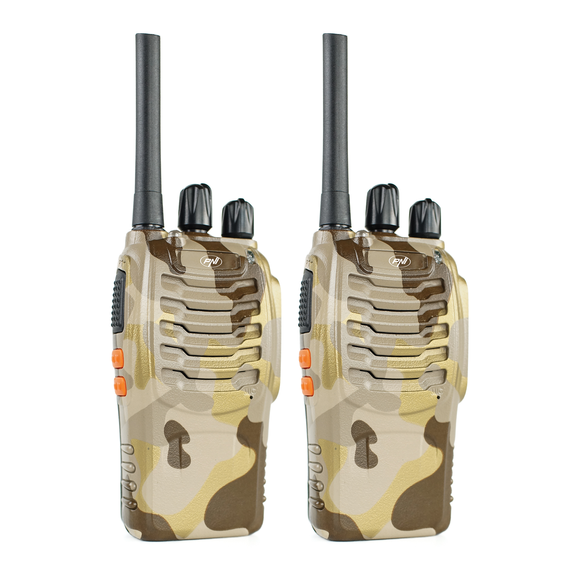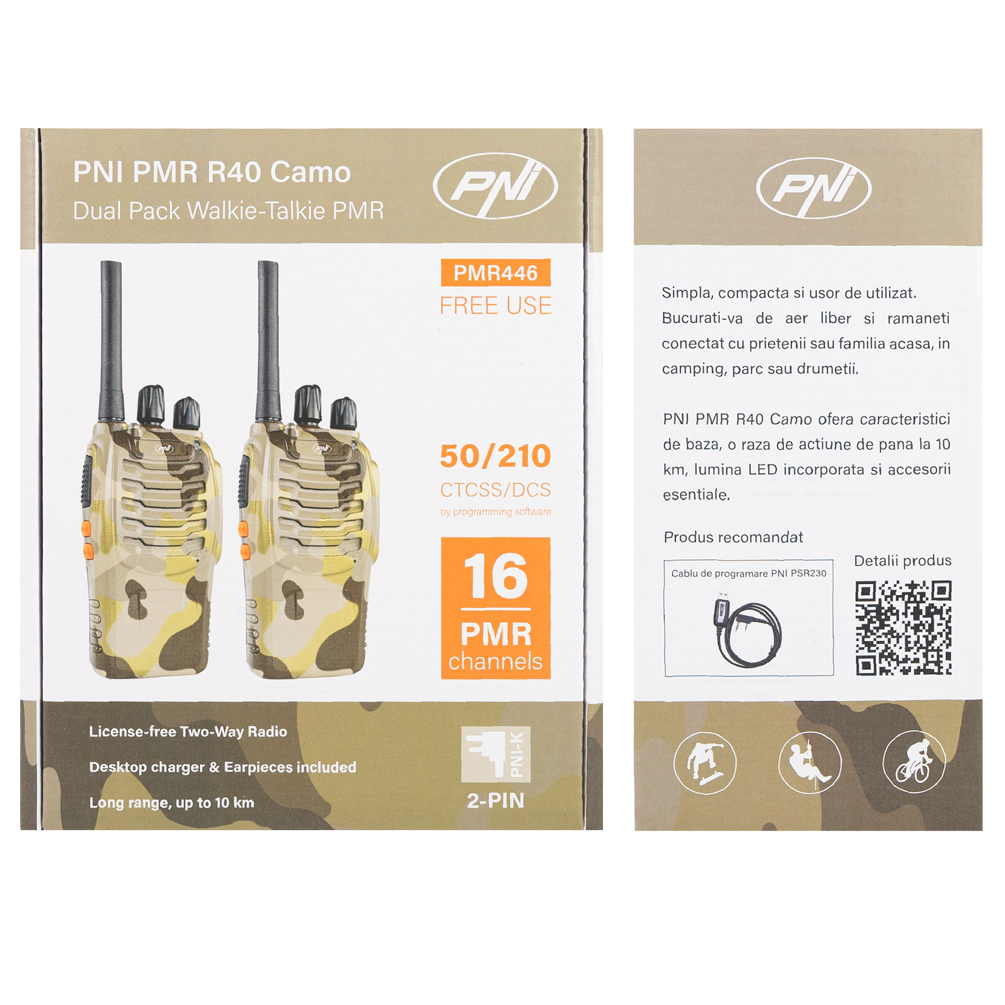 Staţii radio PMR de vanzare la subpret, Statie radio portabila PNI PMR R40 Camo, set cu 2 buc, 0.5W, 16 canale programabile, 16 PMR si tonuri 50 CTCSS si 104 DCS, ASQ, TOT, monitor, programabila, acumulatori 1200mAh, incarcatoare si casti incluse.